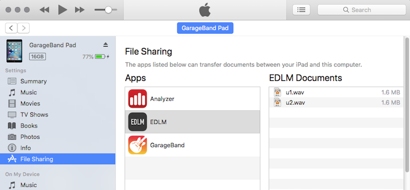 In iTunes select your device, navigate to File Sharing and select the EDLM app. User recordings must be named u1.wav and u2.wav. Drag the files to EDLM documents and restart the app.